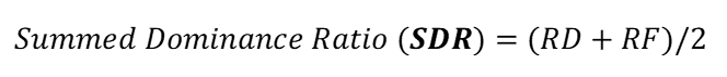 The Summed Dominance Ratio (SDR) was calculated using the relative density (RD) and relative frequency (RF) of the woody species in order to identify the most dominant species within a homegarden. The SDR helps in understanding the growth patterns of different plant species and communities. It provides valuable insights into identifying the most valuable and useful species for a specific cluster, region, or area.