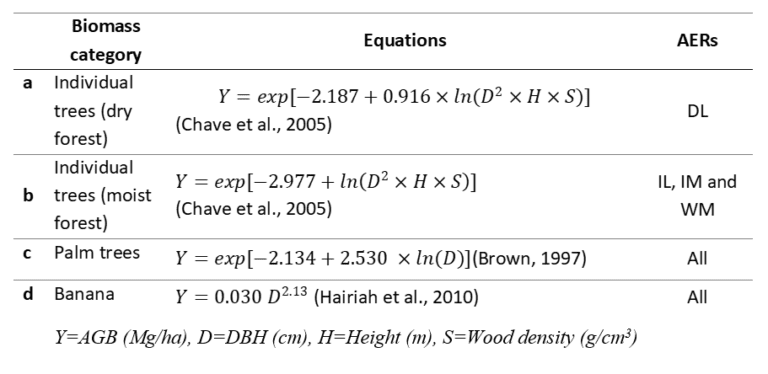 The AGB of floral component is a prominent factor to be considered when addressing the resilience of a homegarden. Since there were no allometric equations developed specifically for Sri Lankan homegardens, pantropical allometric equations which have been developed for tropical natural forests (Table 2) were used to calculate AGB. These equations were applied to individual tree and the cumulative value was taken to calculate the total AGB in each homegarden. Different equations were used for different AERs to make them compatible with the original circumstances which were considered in developing the particular equation (Table 2). The AGB was converted to carbon stock with the assumption that carbon accounted for 50% of the total AGB of the system.